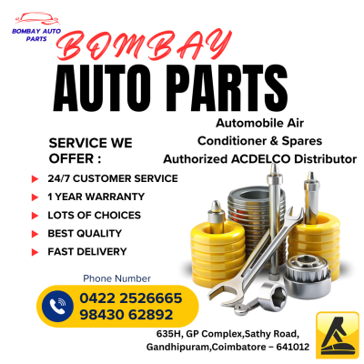 BOMBAY AUTO PARTS Dealers In: Automobile Air Conditioner & Spares Authorized ACDELCO Distributor Email: bapcbe@gmail.com Contact Numbers: ???? 2526665 ???? 9843062892 Address: 635H, GP Complex,Sathy Road,Gandhipuram Coimbatore – 641012